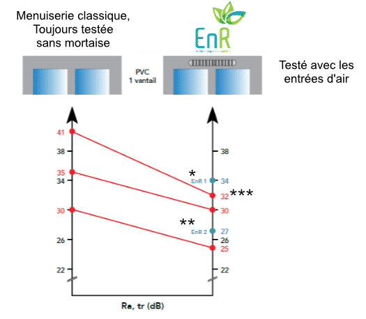 La conception de la fenêtre EnR lui permet d’atteindre d’excellentes performances acoustiques. En effet, le triple vitrage de la fenêtre EnR fonctionne comme un piège à son. À la différence des fenêtres classiques où la simple mortaise de ventilation représente un véritable point faible acoustique, le passage de l’air entre les vitrages de la fenêtre EnR favorise l’isolation phonique du bâtiment.