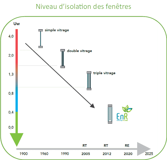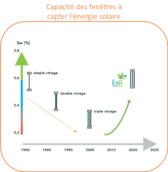 L’énergie solaire est bien connue pour être une énergie verte, gratuite et disponible pour tous. Mais dans le bâtiment, elle est souvent laissée de côté au profit d’une meilleure isolation. En passant successivement du simple, au double puis au triple vitrage, nous avons peu à peu fermé nos bâtiments au soleil. Une fenêtre simple vitrage laisse passer 60% de l’énergie solaire qui la frappe, alors que le double vitrage laisse passer 40% et le triple vitrage seulement 35%. La fenêtre EnR permet d’optimiser les apports solaires tout en conservant une bonne isolation thermique.